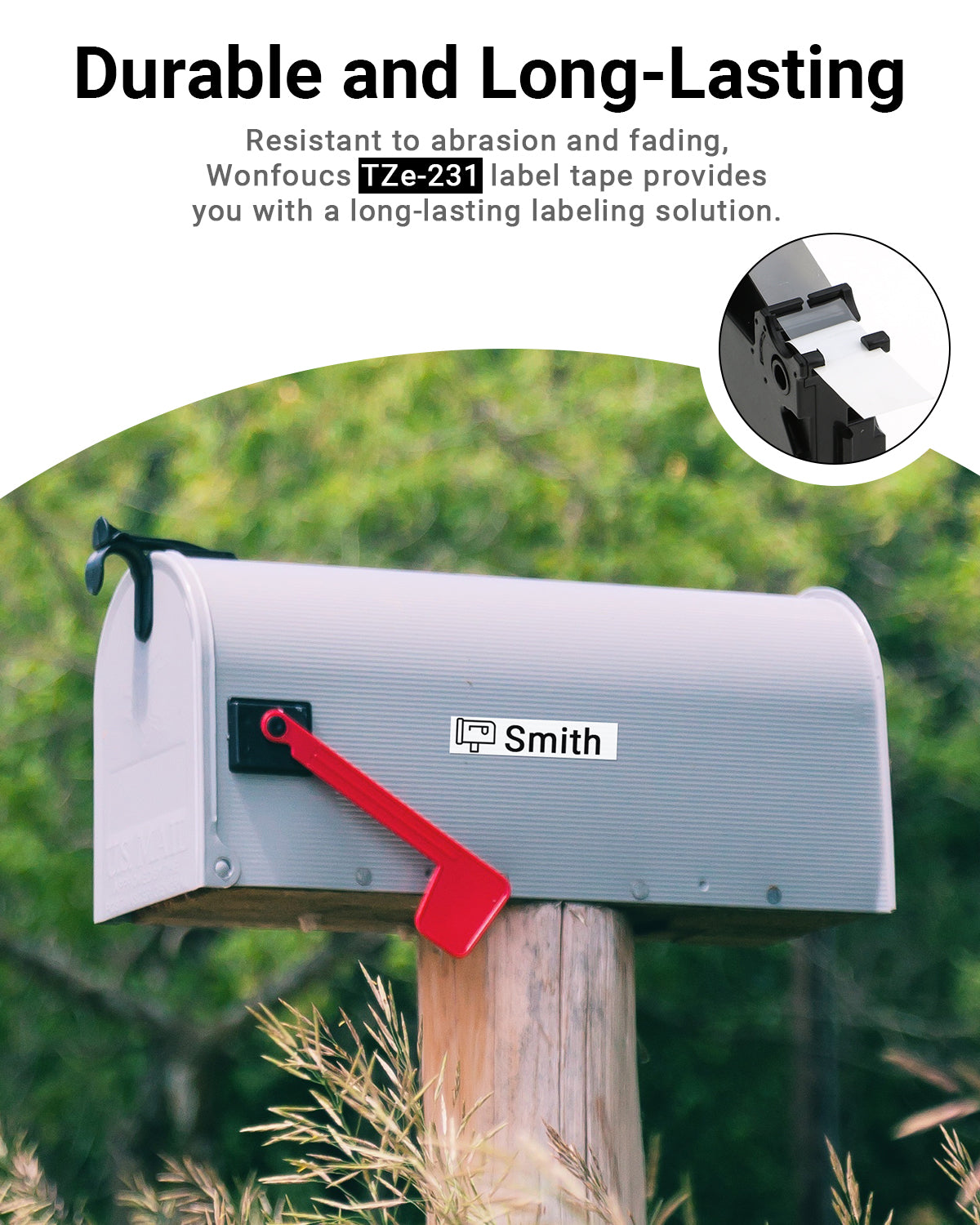 - Standard laminated replacement for Brother tape 12mm 0.47 laminated white tze 231 is durable, withstand to fading and water damage, and won’t smudge or smear. It is suitable for indoor or outdoor use, even in harsh weather conditions.