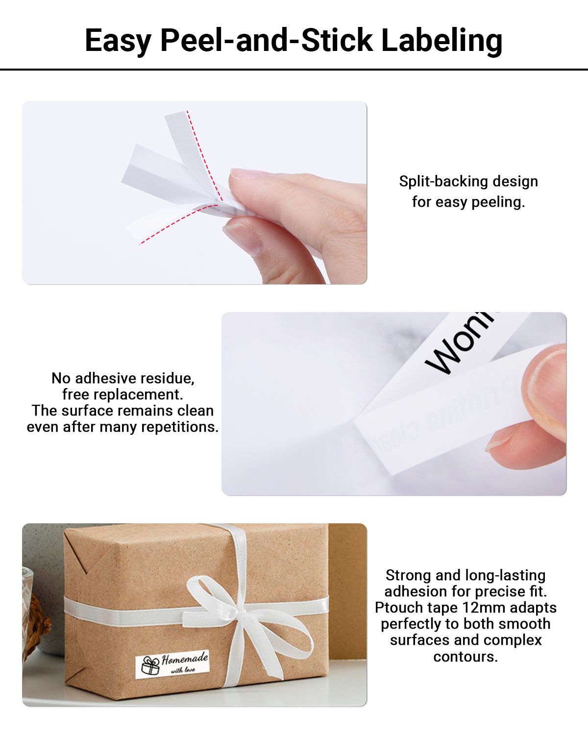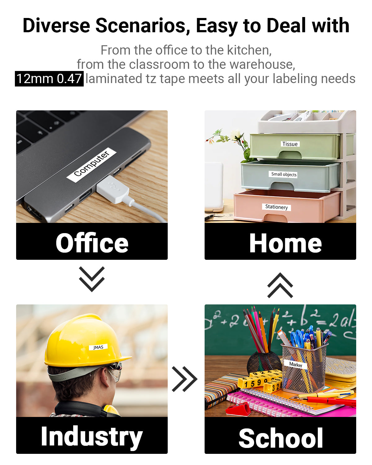 - Easy to peel – Compatible tz tape 12mm 0.47 laminated white p touch label tape has a split-back design and is simple to remove.